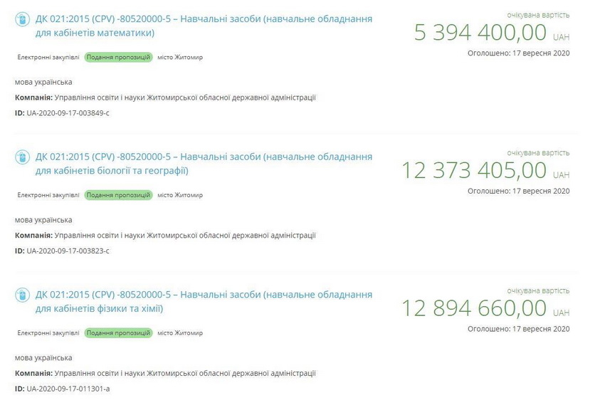 Управління освіти і науки Житомирської обласної державної адміністрації оголосило три тендери на придбання комплектів навчального обладнання для кабінетів фізики, хімії, біології, географії та математики для 25 шкіл Житомирської області. Планують закупити навчальне обладнання на понад 30,6 млн грн.
