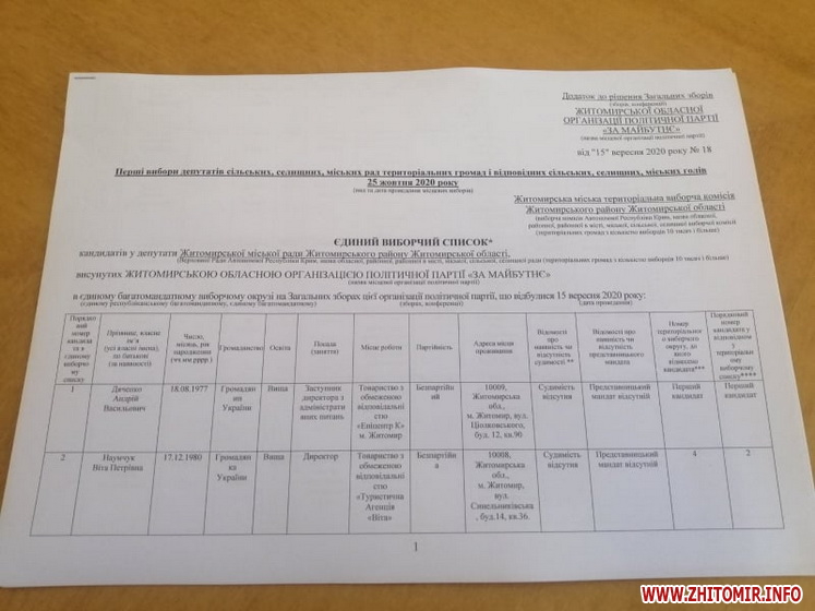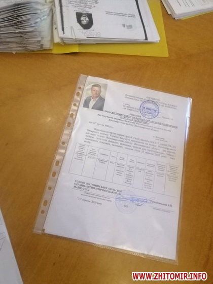 Також МВК отримала від партії список 40 кандидатів у депутати Житомирської міської ради, який очолює Дяченко.