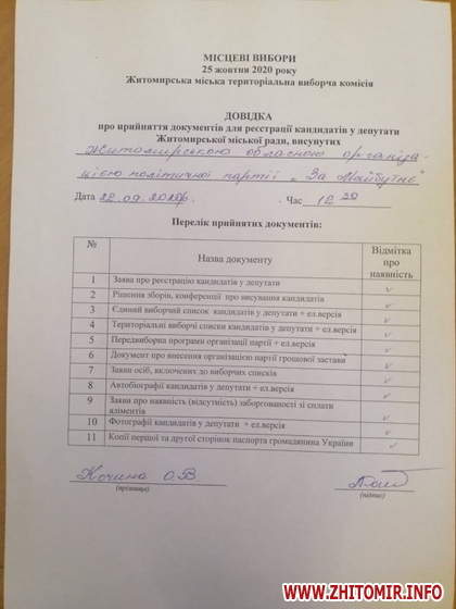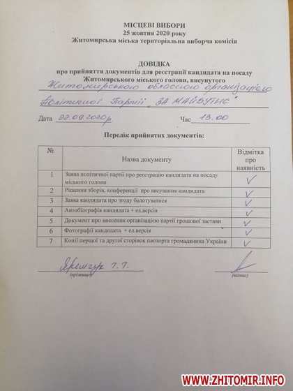 Житомирська міська територіальна виборча комісія 22 вересня прийняла документи від першого кандидата в мери – висуванця партії «За майбутнє» Андрія Дяченка.