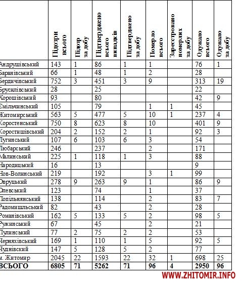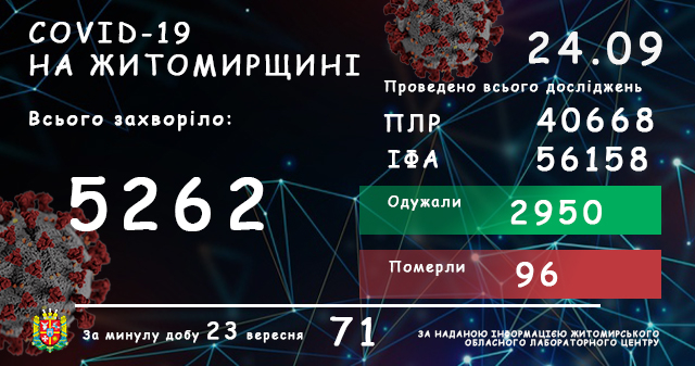Станом на 9:00 год. 24 вересня у Житомирській області лабораторно підтверджено 5262 випадки коронавірусної хвороби. Протягом останньої доби, 23 вересня, COVID-19 діагностували у 71 жителя області. Також зареєстровано чотири нові летальні випадки, спричинені ускладненнями хвороби.