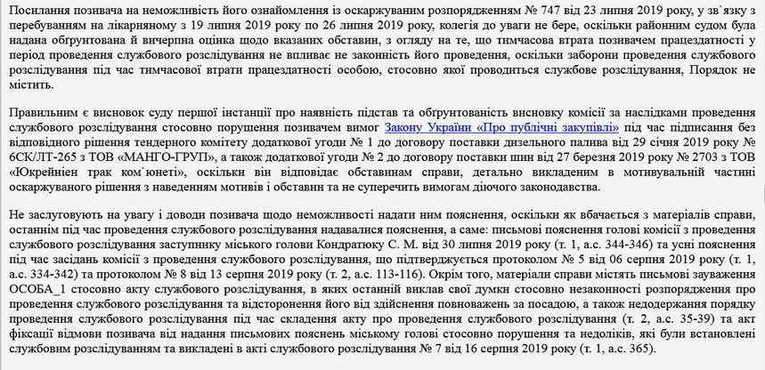 «Рішенням Житомирського районного суду Житомирської області від 02 червня 2020 року у задоволенні позовних вимог ОСОБА_1 відмовлено. Не погоджуючись із рішенням суду першої інстанції позивач ОСОБА_1 подав апеляційну скаргу, в якій просив рішення суду скасувати та ухвалити нове - про задоволення позовних вимог у повному обсязі. В обґрунтування скарги зазначив, що в матеріалах справи відсутні належні та допустимі докази наявності порушення адміністративного чи кримінального провадження щодо невиконання чи неналежного виконання ним посадових обов`язків, перевищення службових повноважень, завдання матеріальної шкоди підприємству, громаді чи державі. Зазначив, що із оскаржуваним розпорядженням № 747 від 23 липня 2019 року він не міг бути ознайомлений, оскільки з 19 липня 2019 року по 26 липня 2019 року перебував на лікарняному, що підтверджується листком непрацездатності. Вказує, що проведення службового розслідування було формальністю з завідомо відомим результатом», - йдеться в матеріалах суду.