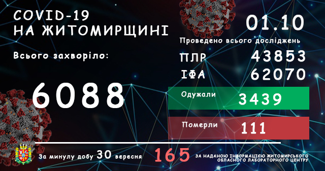 Станом на ранок 1 жовтня у Житомирській області лабораторно підтверджено 6088 випадків коронавірусу, з них одужало 3439 пацієнтів, померли 111 людей. За останню добу в області встановили новий рекорд за кількістю виявлених випадків COVID-19 – 165 нових інфікувань.