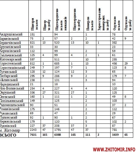 - Житомирському районі – 13 (Двірець – жінка, 35 років; Зарічани – жінка, 63 роки; Новогуйвинське – жінка, 27 років; чоловік, 27 років; Озерне – жінка, 67 років; жінка, 52 роки; чоловік, 44 роки; Садки – чоловік, 41 рік; жінка, 51 рік; Сінгури – жінка, 49 років; Соснівка – жінка, 54 роки; Станишівка – жінка, 45 років; чоловік, 38 років);