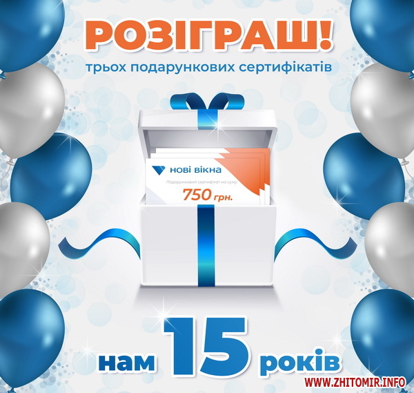 Цієї осені, 1 жовтня, ТМ «Нові Вікна» відзначає своє 15-річчя. Компанія завжди була щедрою на подарунки. Тож і цього разу підготувала приємний сюрприз – розіграш сертифікатів. Троє щасливчиків отримають подарунковий сертифікат на суму 750 грн. Шанс стати переможцем має кожен.