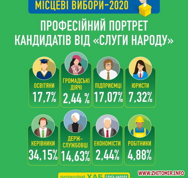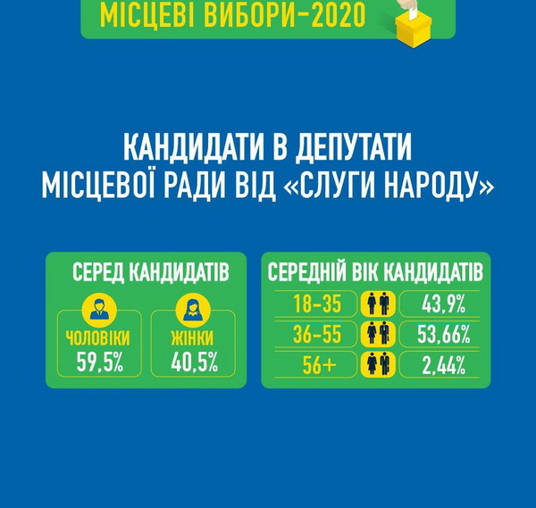 Кандидати до місцевих рад від «Слуги народу» — професіонали, які досягли значних успіхів у різних сферах — це управлінці (34.2%), підприємці (17%), освітяни (17%), державні службовці (14,6%), робітники, юристи, громадські діячі.
