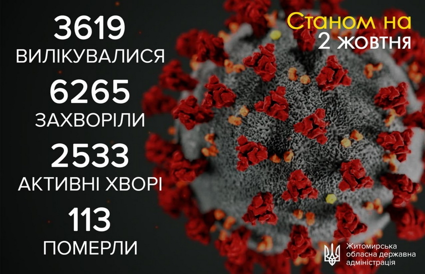 Як повідомляв Житомир.info, станом на ранок 2 жовтня 2020 року в Житомирській області лабораторно підтвердили 6265 випадків коронавірусної хвороби, з них 3619 людей одужали, 113 – померли. За минулу добу, 1 жовтня, зареєстрували новий антирекорд — 177 інфікувань.