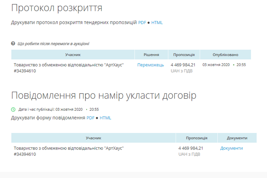 Про це йдеться у звіті про проведення закупівлі додаткових робіт у того самого підрядника – ТОВ «АртХаус», з яким 5 квітня 2018 року був укладений основний договір на загальну суму 19,7 млн грн. Інформація про додаткову закупівлю оприлюднена на ресурсі ProZorro.