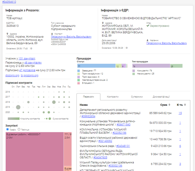 За інформацією clarity-project.info, ТОВ «АртХаус» є переможцем у 48 закупівлях на загальну суму 212,8 млн грн. Найбільше договорів укладено з департаментом регіонального розвитку Житомирської ОДА (15 договорів на 85,6 млн грн).