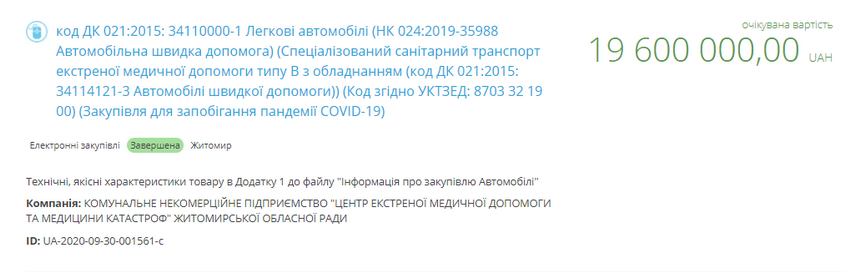 За поставку 10 спеціалізованих санітарних автомобілів екстреної медичної допомоги типу В з обладнанням замовник має заплатити 19 млн 600 тис. грн.