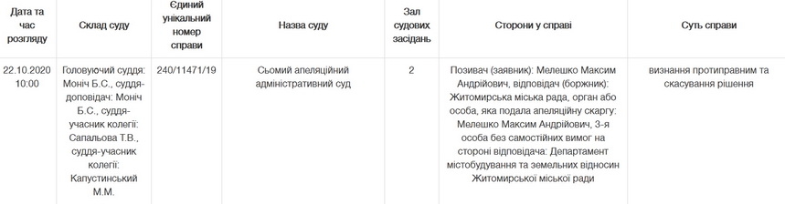 Максим Мелешко (Перемога Пальчевського) позивається до Житомирської міської ради щодо визнання протиправним та скасування рішення, справу 22 жовтня розглядатиме Сьомий апеляційний адміністративний суд.