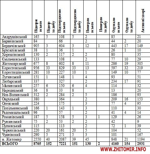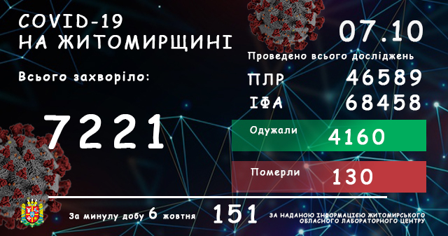 «За інформацією директора ДУ “Житомирський обласний лабораторний центр” Зіновія Парамонова, станом на 09:00 07.10.2020 (за минулу добу – 06 жовтня) зареєстровано 151 новий лабораторно підтверджений випадок». – йдеться у повідомленні.