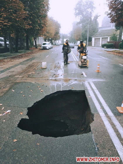 На вулиці Фещенка-Чопівського у Житомирі 8 жовтня провалився асфальт – посеред дороги утворилася велика яма. Сталося це внаслідок пориву каналізаційного колектору. Рух транспорту вулицею призупинили.
