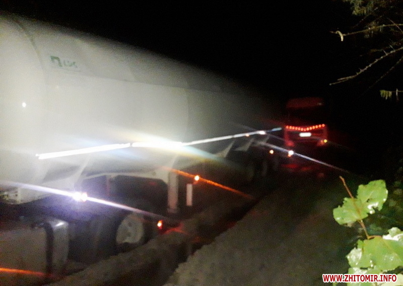 «8 жовтня о 21:15 до служби порятунку «101» надійшло повідомлення про те, що поблизу с. Чижівка Новоград-Волинського району вантажівка перекрила рух транспортним засобам. По прибуттю рятувальників до місця виклику було встановлено, що вантажний автомобіль Mersedes, що був завантажений близько 40 т газу, на об’їзній ґрунтовій дорозі з’їхав у кювет та застряв. Внаслідок цього було перекриту рух автомобільного транспорту по всій проїжджій частині», - повідомили рятувальники.