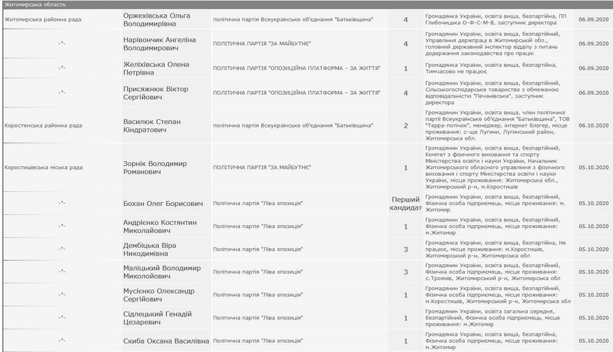 Щодо кандидатів в депутати, то найбільше вибуло претендентів на мандати депутатів Коростишівської міської ради – 14, серед яких 11 є кандидатами від партії «Ліва опозиція», в тому числі й перший кандидат. В Житомирську районну раду відмовилися балотуватися чотири кандидати.