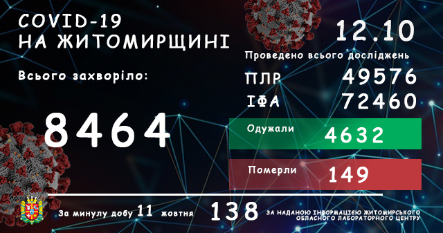 Станом на ранок 12 жовтня у Житомирській області лабораторно підтверджено 8464 випадки COVID-19, з них 138 – виявлені упродовж останньої доби. Також за минулу добу зафіксовано 5 летальних випадків, пов’язаних з коронавірусом.