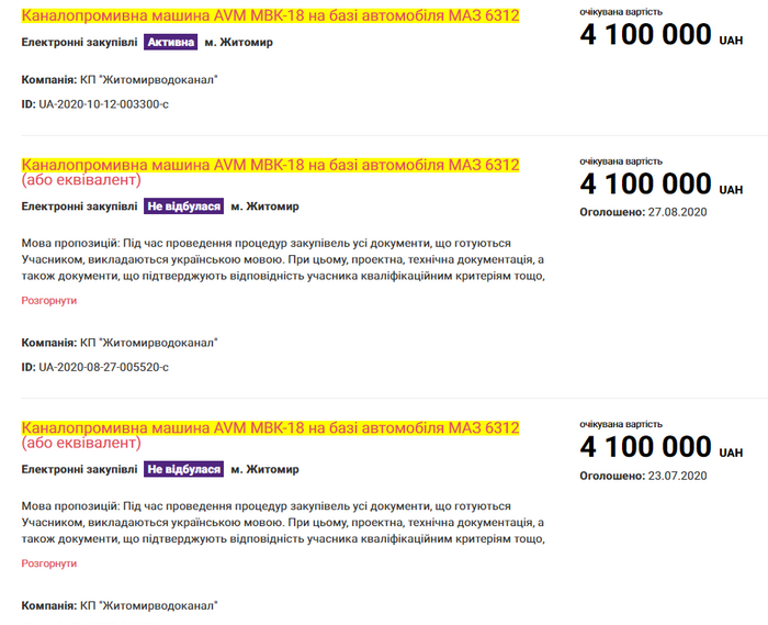 КП «Житомирводоканал» застосував переговорну процедуру закупівлі і має намір укласти договір з Дочірнім підприємством «Автомаз-Україна» на придбання каналопромивної машини AVM MBK-18 на базі автомобіля МАЗ 6312 за 4,1 млн грн.