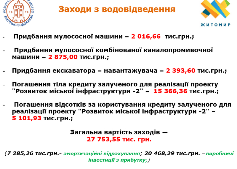Нагадаємо, наприкінці листопада 2019 Житомирський міськвиконком погодив інвестиційну програму КП «Житомирводоканал» на 2020 рік: з 65,5 млн грн 80% становить погашення кредиту та відсотків. У даній програмі одним з пунктів передбачалося придбання мулососної машини за 2 млн 16,66 тис. грн та мулососної комбінованої каналопромивочної машини за 2 млн 875 тис. грн.