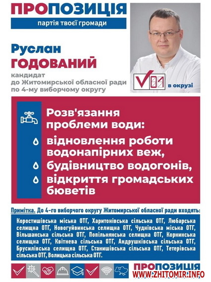На нагальності розв’язання цього питання наголошує кандидат у депутати Житомирської обласної ради по 4 виборчому округу від партії «Пропозиція» Руслан Годований. На його переконання, лише завдяки вчасно вжитим заходам із розроблення додаткових джерел водозабезпечення, область зможе протистояти існуючій загрозі.