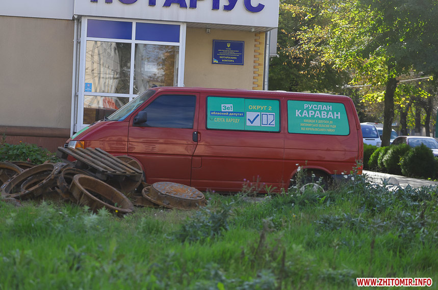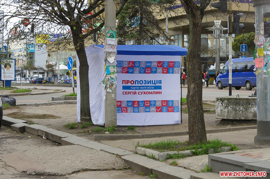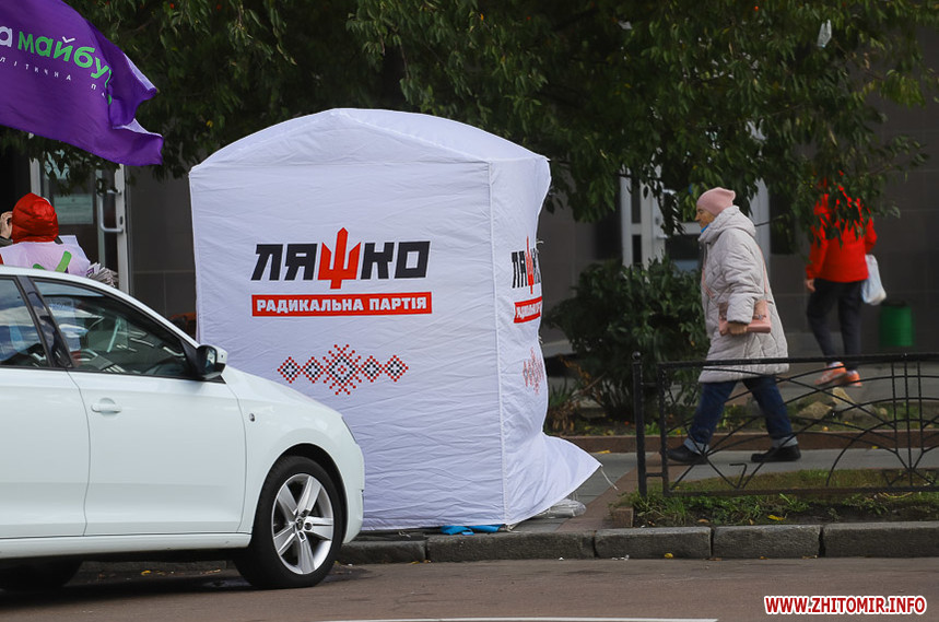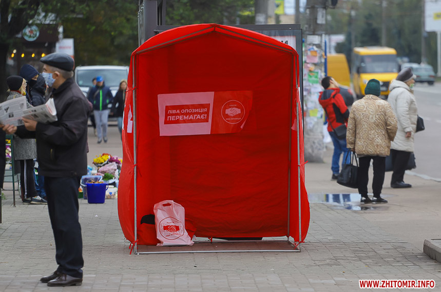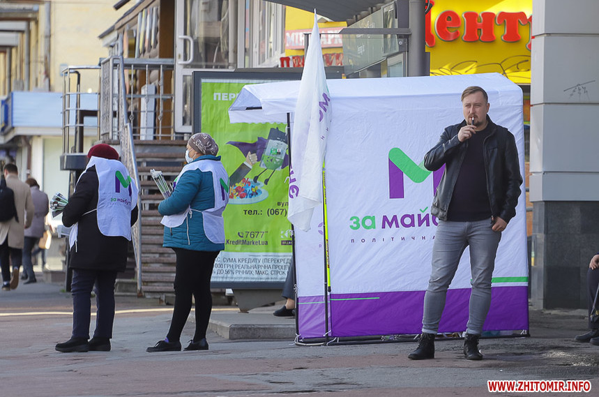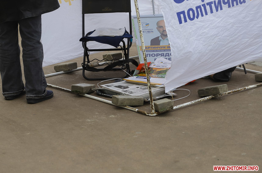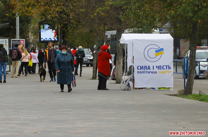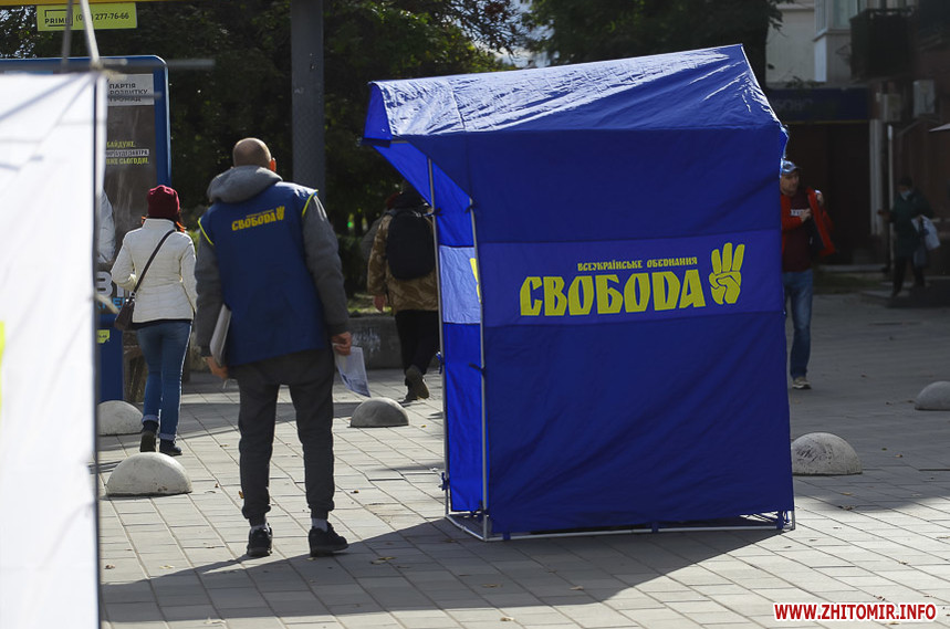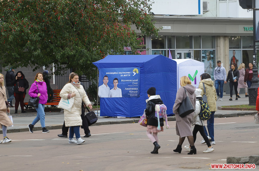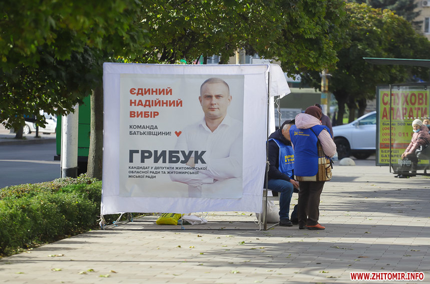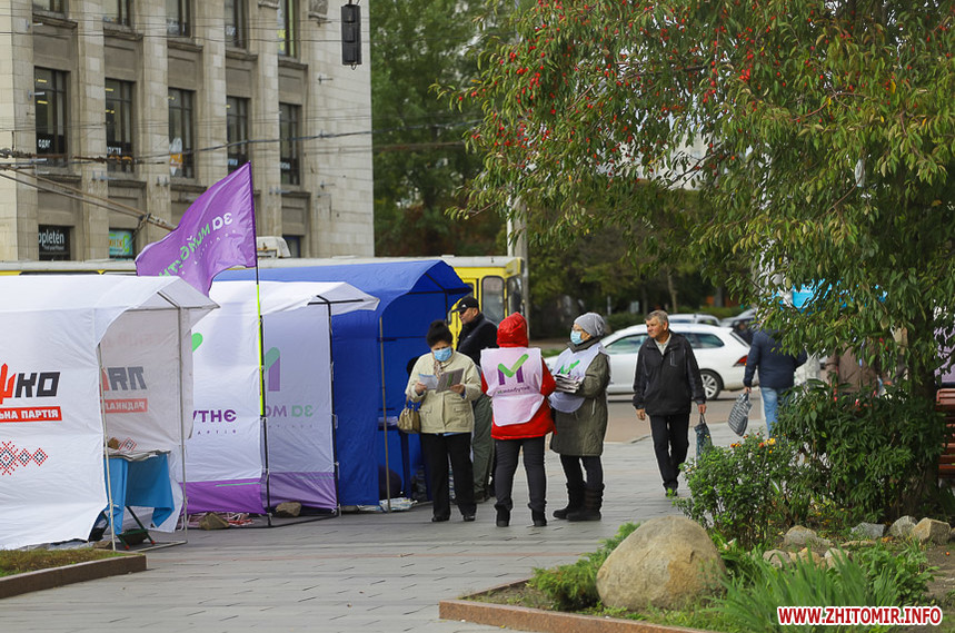 19 жовтня, за 5 днів до дня голосування на місцевих виборах, Житомир.info закарбував на фото «загострення симптомів» передвиборчої лихоманки: безліч палаток, кубів і агітаторів у партійних накидках-жилетках.
