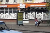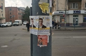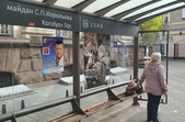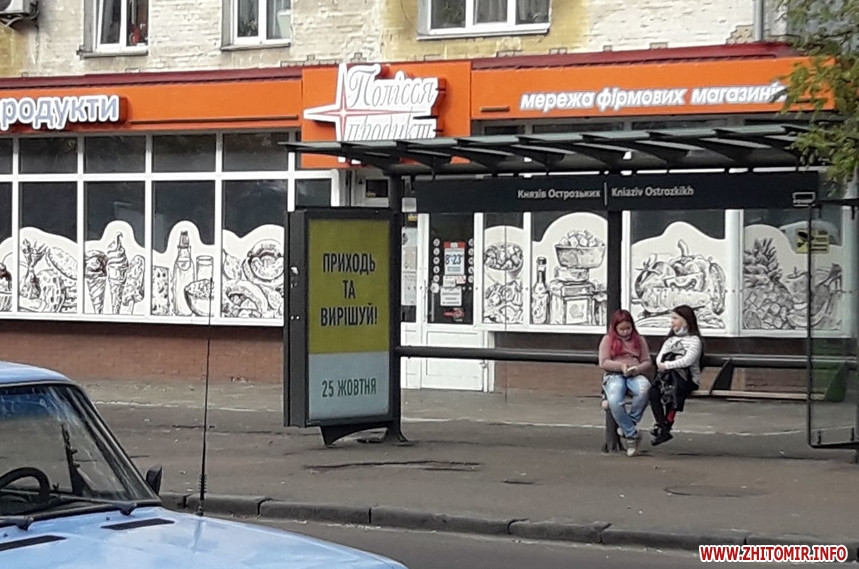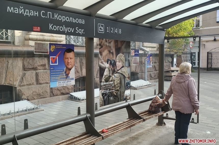 Плакати з обличчями деяких кандидатів та передвиборчими тезами висять і на зупинках громадського транспорту, зокрема, на Великій Бердичівській.