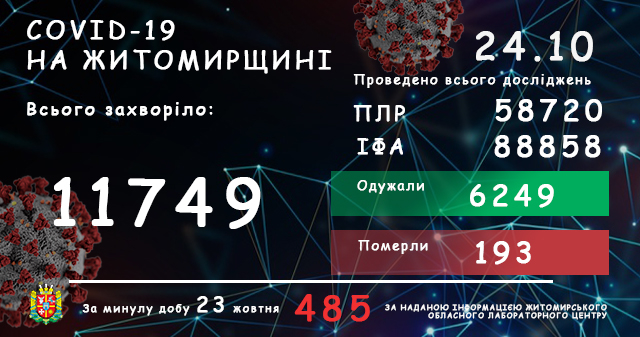 Станом на 9:00 год. 24 жовтня у Житомирській області виявили 11749 випадків коронавірусної хвороби. Зокрема, за минулу добу, 23 жовтня, зареєстровано новий антирекорд – 485 нових лабораторно підтверджених випадків COVID-19. За добу зафіксували 5 летальних випадків, спричинених ускладненнями хвороби.