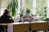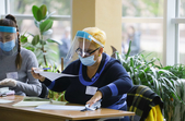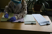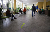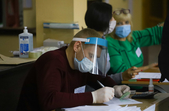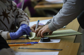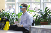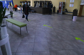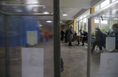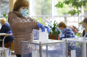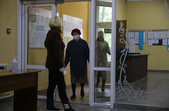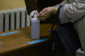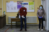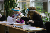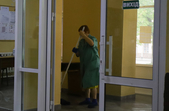 Кожен з членів ДВК сидить за окремим столом, усі в рукавичках, масках і з захисними щитками. Прибиральниця періодично протирає підлогу у приміщенні вологою ганчіркою.