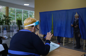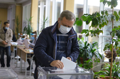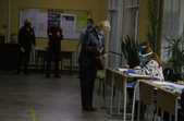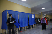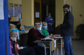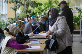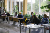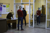 Виборцям проводять температурний скринінг та просять дезінфікувати руки антисептиком. У руках багатьох людей можна помітити кулькову ручку, з якою вони прийшли на дільницю.