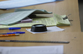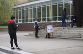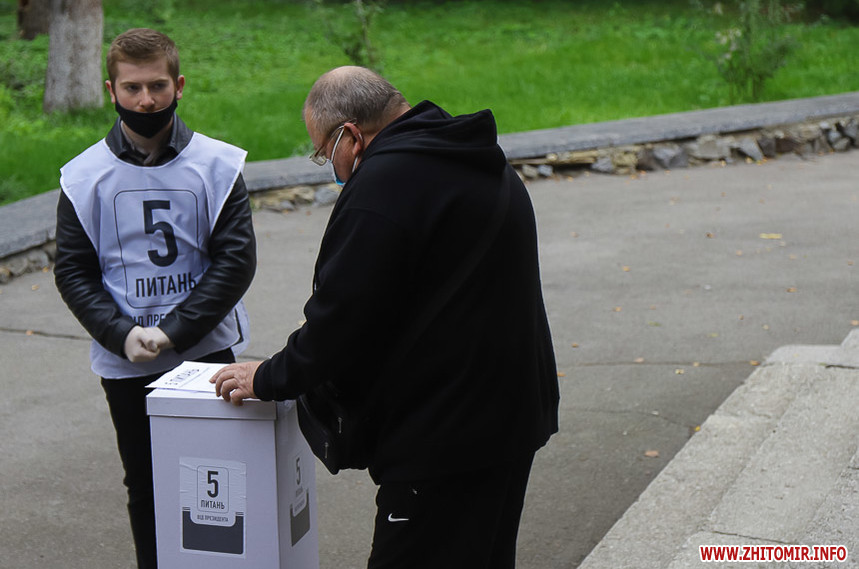 Біля виходу з дільниці працюють волонтери, які проводять всеукраїнське опитування, ініційоване президентом. Це молоді люди у білих жилетах з написом «5 питань від президента». Бланк з запитаннями заповнюють на картонній коробці за типом урни. Туди ж, у скриньку, вкидаються заповнені аркуші.