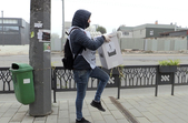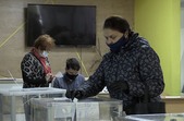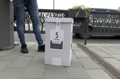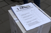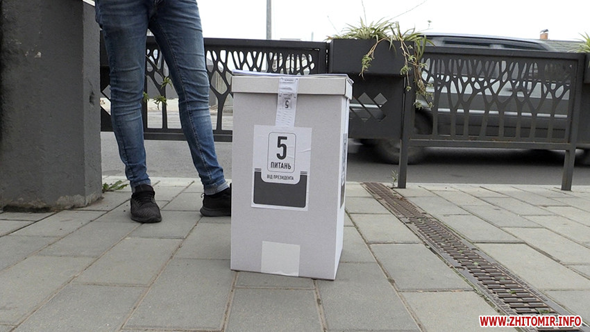 На виході з дільниці виборців очікує волонтер опитування «5 питань від Президента» з окремою скринькою.