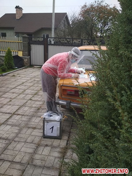 У райцентрі Романів 25 жовтня до родини, яка знаходиться на самоізоляції з підтвердженим діагнозом COVID-19, приїхали представники дільничної виборчої комісії зі скринькою для голосування.