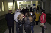 Кілька десятків людей стоять біля входу в на дільницю 181376, яка знаходиться в приміщенні дитсадка №6. Голова ДВК пояснює: скупчення людей пов’язане з тим, що на дільницю одночасно пускають всього декілька людей і кабінок для голосування лише дві.