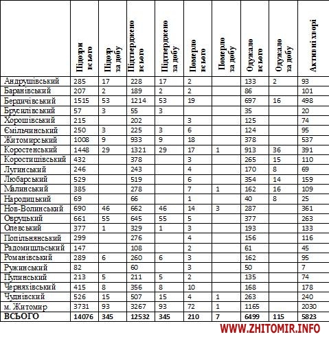 Станом на 9:00 год. 26 жовтня у Житомирській області лабораторно підтверджено 12532 випадків коронавірусної хвороби. Зокрема, за минулу добу, 25 жовтня, COVID-19 виявили у 345 жителів області. Також упродовж доби зафіксували ще 7 летальних випадків.