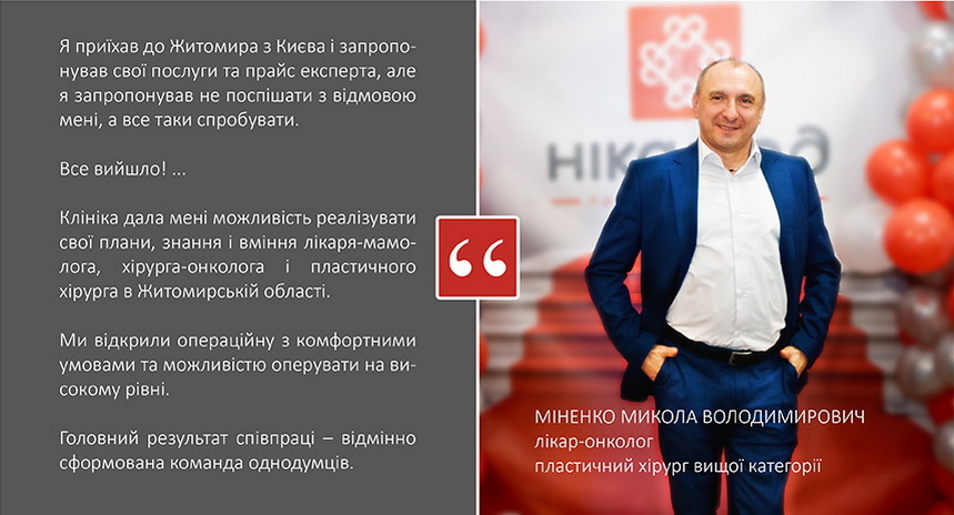 Такі фахівці, як Міненко Н.В, лікар-онколог, пластичний хірург і гінеколог-онколог Дяченко В.В. давно мають репутацію унікальних експертів жіночого і естетичного здоров'я не тільки в нашому місті, а й далеко за його межами.