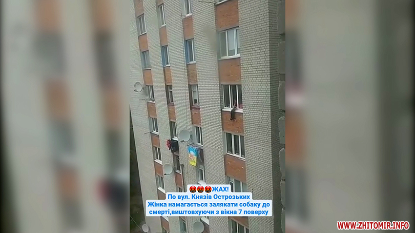 Жінка схопила собаку за задні лапи, виставила його у вікно головою вниз і трусить, а тварина голосно скавчить – таке відео опублікували житомиряни у соціальних мережах 27 жовтня. Автори публікації вказали й адресу: вулиця Князів Острозьких, 93, 7 поверх.