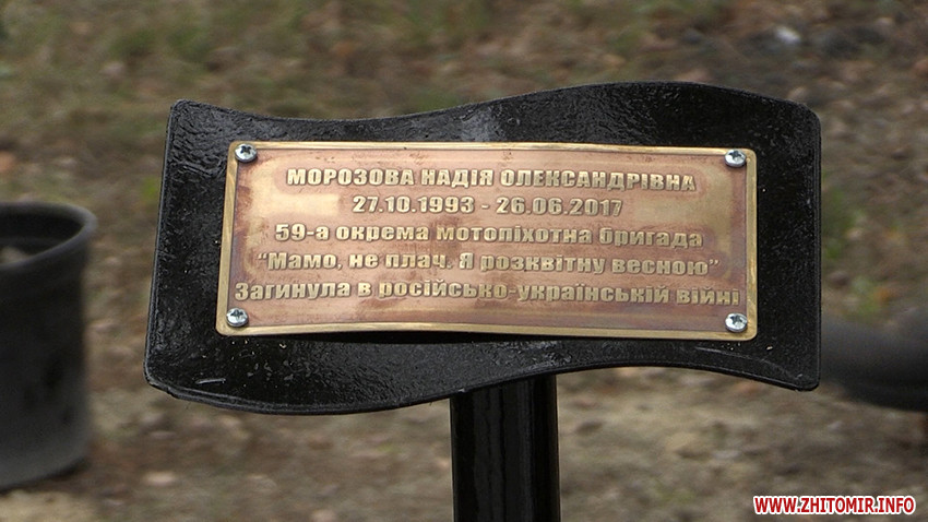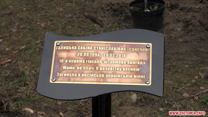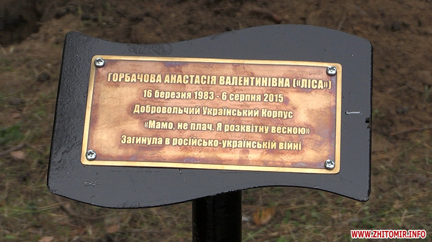 Житомир став шостим містом, де представниці ГО «Жіночий ветеранський рух» висадили алею пам’яті про жінок, які загинули на війні на сході України. За задумом організаторів дерева нагадуватимуть тим, хто сюди приходить, що незалежність України захищають не лише воїни-чоловіки.