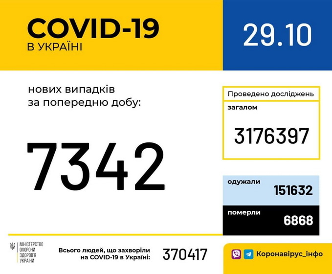«29 жовтня (станом на 9:00) в Україні 370 417 лабораторно підтверджених випадків COVID-19, із них 6 868 летальних, 151 632 пацієнти одужали. За добу зафіксовано 7 342 нових випадки. За добу одужали 2 990 пацієнтів», – йдеться у повідомленні.