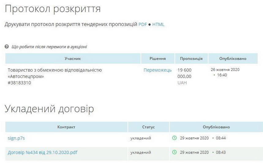 На ресурсі ProZorro 29 жовтня оприлюднений звіт про укладений договір з ТОВ «Автоспецпром» вартістю 19 млн 600 тис. грн, тобто одна «швидка» коштує 1 млн 960 тис. грн.