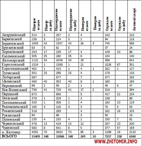 Як повідомляв, Житомир.info, станом на 9:00 год. 29 жовтня в Житомирській області було лабораторно підтверджено 13518 випадків коронавірусної хвороби. Зокрема, за минулу добу, 28 жовтня, вірус COVID-19 виявили у 364 жителів. Також упродовж доби зареєстрували рекордну кількість летальних випадків – 13.