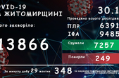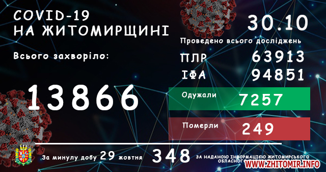 Станом на ранок 30 жовтня у Житомирській області за добу підтвердили 348 нових випадків COVID-19 та зафіксували 10 летальних. Всього захворіли 13866 жителів області.
