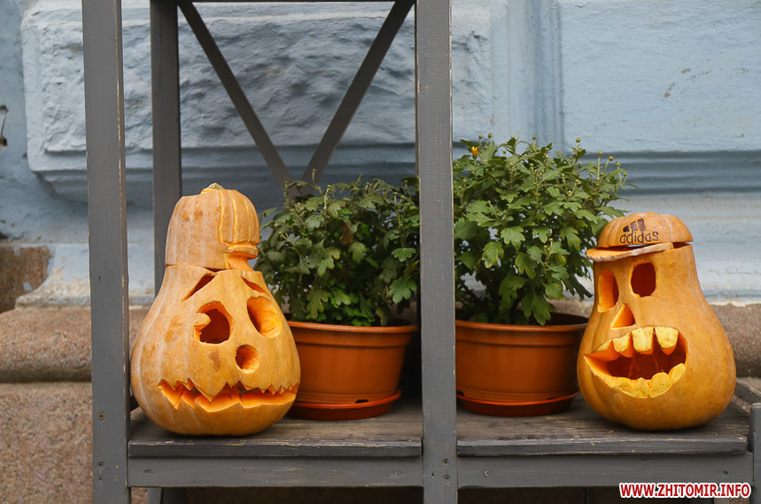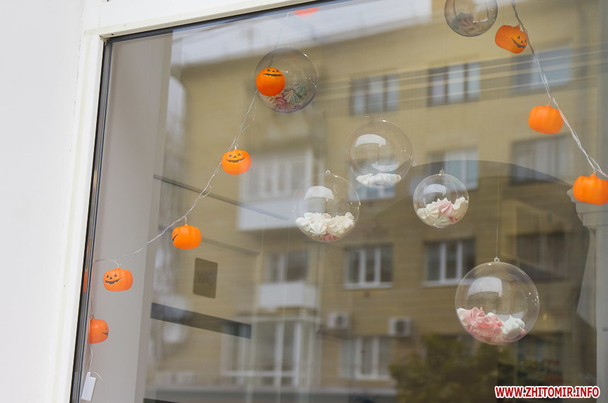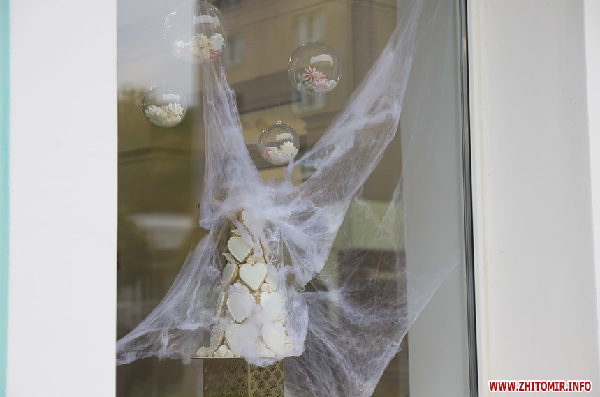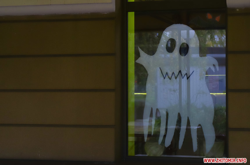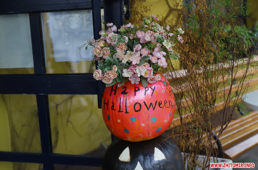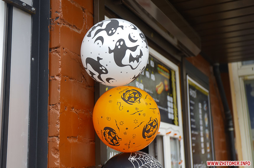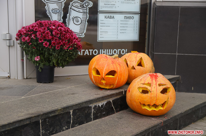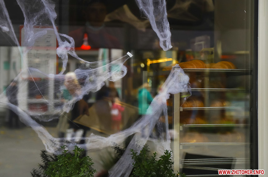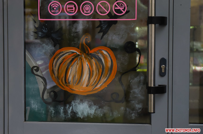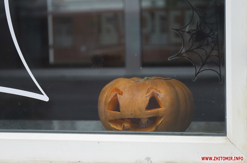 Вікна та вітрини заляпані «кров’ю» і засновані «павутинням», а вхід охороняють моторошно-грайливі гарбузи, широко розплющивши «очі» чудернацької форми та вишкіривши «зуби» – так 30 жовтня прикрашені деякі магазини і кафе у центрі Житомира. Новий антураж створили до дня Геловіну, який відзначається в ніч проти 1 листопада.