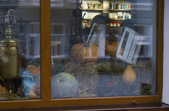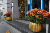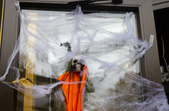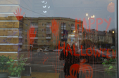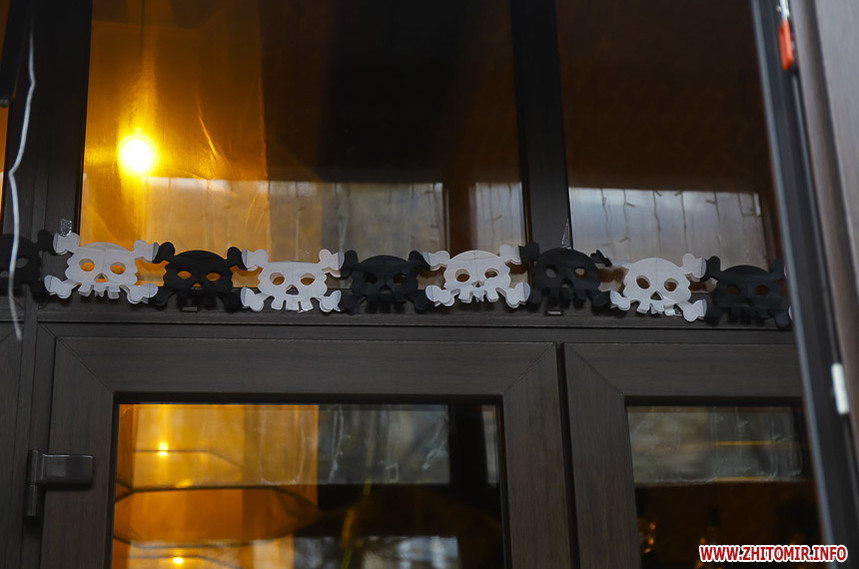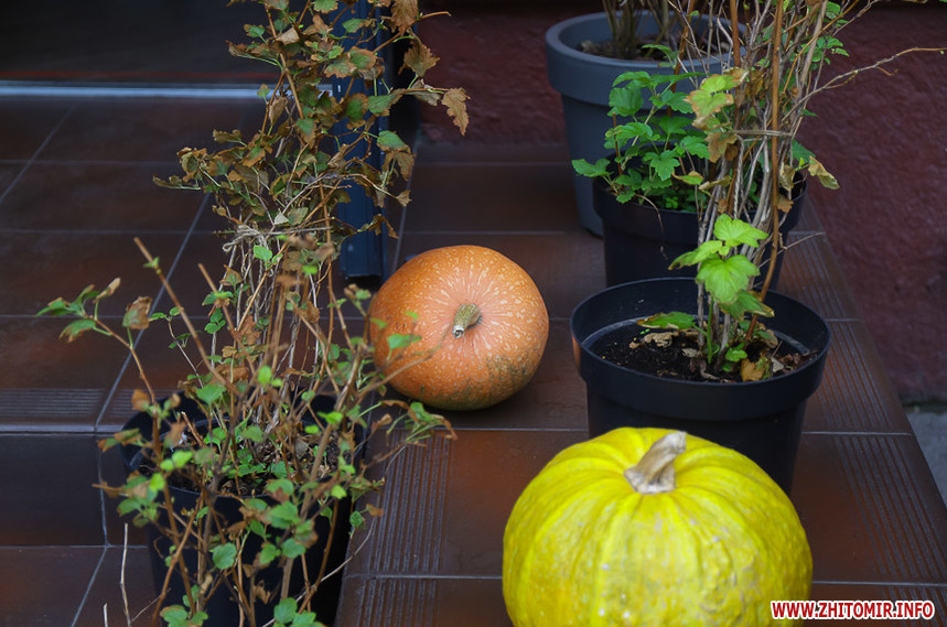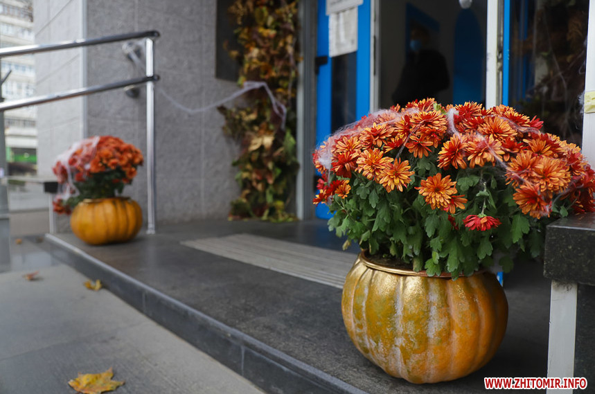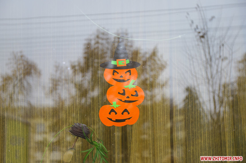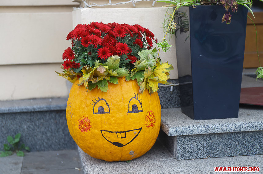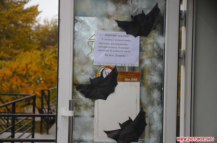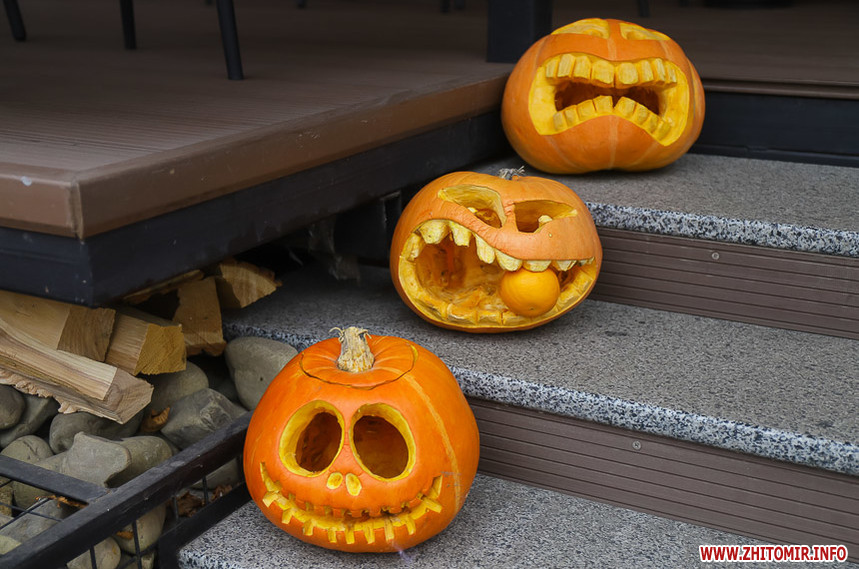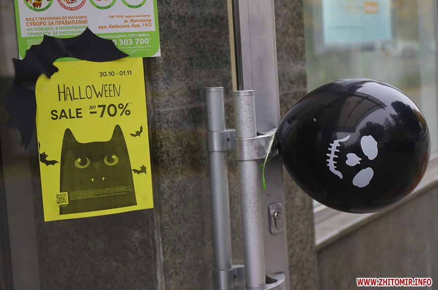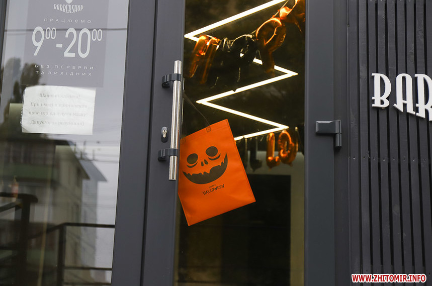 Вікна та вітрини заляпані «кров’ю» і засновані «павутинням», а вхід охороняють моторошно-грайливі гарбузи, широко розплющивши «очі» чудернацької форми та вишкіривши «зуби» – так 30 жовтня прикрашені деякі магазини і кафе у центрі Житомира. Новий антураж створили до дня Геловіну, який відзначається в ніч проти 1 листопада.