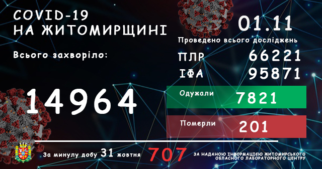 Станом на 09:00 год. 1 листопада 2020 року (за минулу добу – 31 жовтня) зареєстровано найбільший антирекорд — 707 нових лабораторно підтверджених випадків.