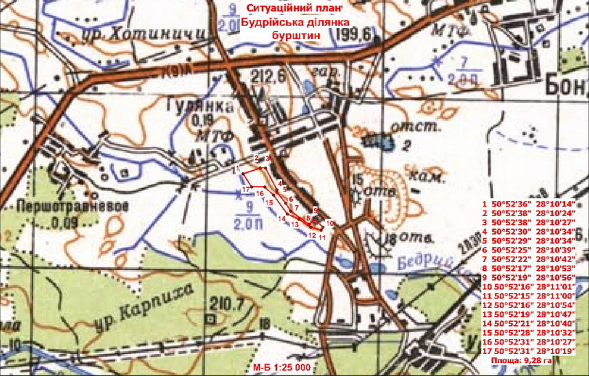 «Будрійська ділянка в адміністративному відношенні розташована у Коростенському районі Житомирської області на південно-західній околиці с. Гулянка. Ділянка розташована на відстані 33 км від районного центру м. Коростень. На відстані 2 км від ділянки знаходиться з.ст Ушиця. Вид користування надрами та строк, на який надається дозвіл: геологічне вивчення бурштиноносних надр, у тому числі дослідно-промислова розробка родовищ з подальшим видобуванням бурштину (промислова розробка родовищ), 5 років», - зазначається в описі лоту.