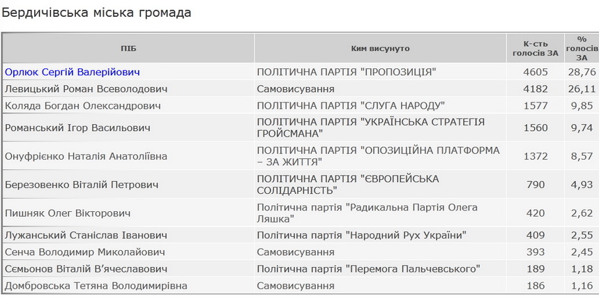 На сайті Центральної виборчої комісії 6 листопада оприлюднили підсумки виборів Бердичівського міського голови.