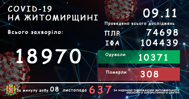 Станом на 9:00 год. 9 листопада в Житомирській області лабораторно підтвердили 18970 випадків коронавірусної хвороби. Зокрема, за минулу добу, 8 листопада, виявили 637 нових інфікувань COVID-19 та зареєстрували 7 летальних випадків. Нових випадків одужання за добу не зафіксували.