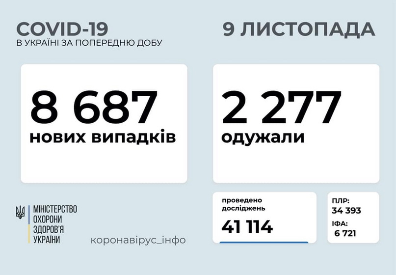 Загалом за минулу добу в Україні зафіксовано 8 687 нових випадків коронавірусної хвороби COVID-19 (з них дітей – 350, медпрацівників – 321).