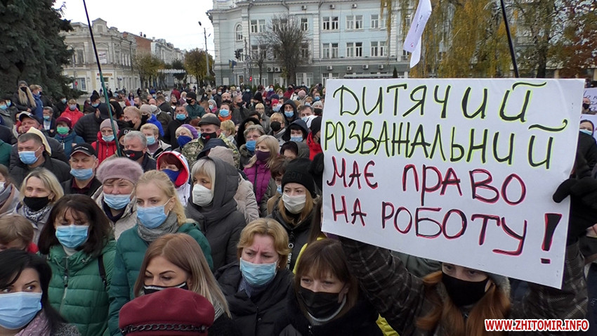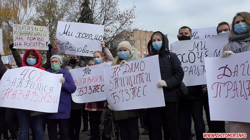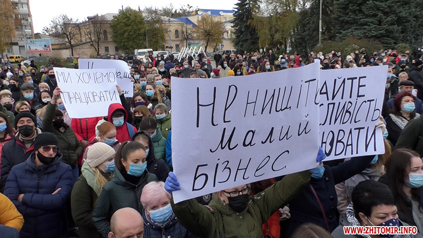 Близько тисячі підприємців 9 листопада влаштували мітинг на майдані Корольова у Житомирі. Вони вимагають не закривати малий бізнес під час карантину на території області, також скасувати введення касових апаратів. До мітингувальників вийшов голова Житомирської ОДА Віталій Бунечко, якому підприємці передали звернення з вимогами.