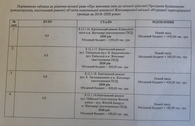 За це депутати проголосували на позачерговій сесії міської ради 10 листопада під час внесення змін до міської цільової програми «Будівництво (реконструкція, капітальний ремонт) об’єктів комунальної власності Житомирської міської об’єднаної територіальної громади на 2018-2020 роки.