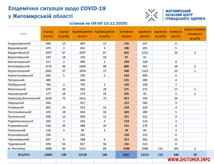 Станом на 09:00 год. 13 листопада в Житомирській області лабораторно підтверджено 21138 випадків коронавірусної хвороби. Зокрема, за минулу добу, 12 листопада COVID-19 виявили у 549 осіб. Кількість летальних випадків за період пандемії становить 344, з них 10 – нові. Подолали коронавірусну інфекцію 11527 осіб, у тому числі за минулу добу зафіксовано 131 випадок одужання.