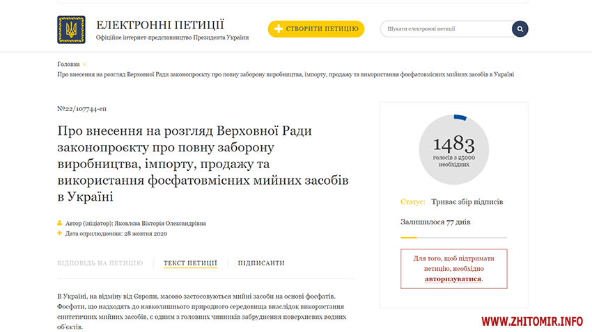 Заборонити виробництво, продаж, імпорт та використання фосфатовмісних мийних засобів – таку петицію зареєстрували на сайті президента України. ЇЇ ініціювала асоціація «Укрводоканалекологія». Директор житомирського водоканалу Андрій Нікітін пояснює: фосфати, які входять до складу таких засобів, потрапляючи у водойми виконують роль добрива. Це призводить до швидкого розмноження синьо-зелених водоростей і як наслідок до погіршення якості води в річках. За словами Андрія Нікітіна в Україні нині немає очисних споруд води, які могли б справлятися з очищенням води, яка має велику концентрацію таких водоростей і саме тому одним із можливих рішень, може бути заборона використання фосфатовмісних мийних засобів.